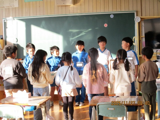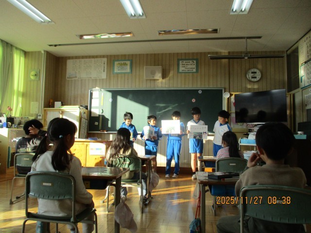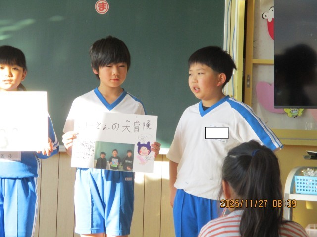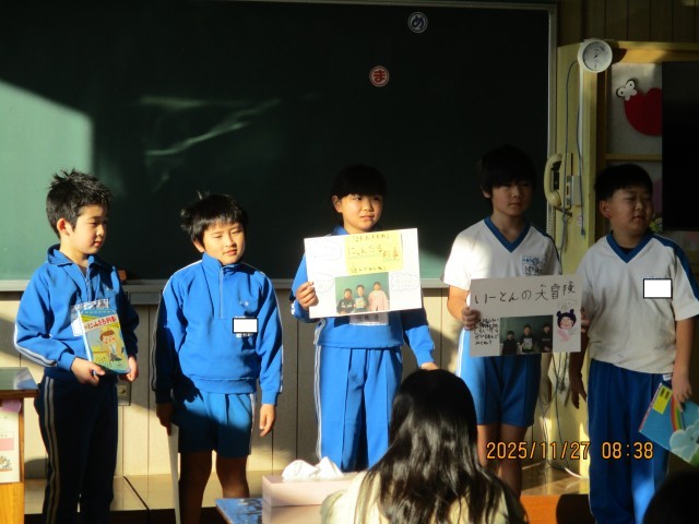 3年生の国語で、1年生に楽しい本を教えてあげるために、班で一冊のおすすめの本を決め、話し合いをしながら紹介する学習を行いました。