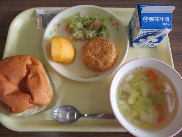 共通のメニューは、バンズパン、牛乳、フレンチサラダ、白菜スープです。