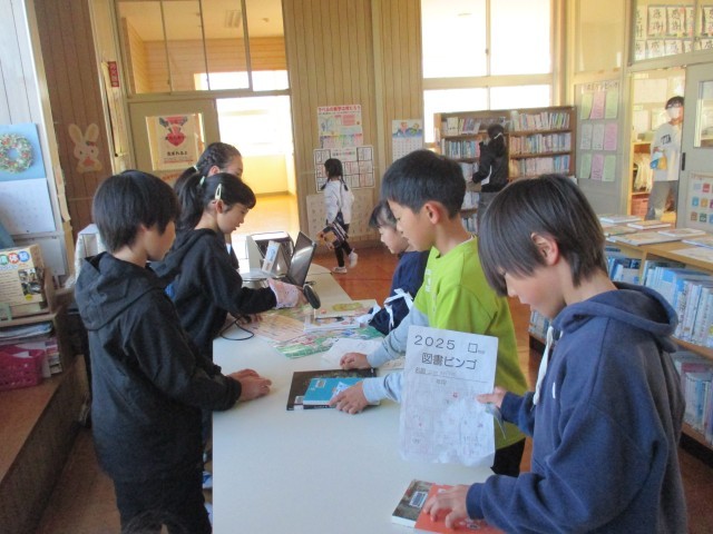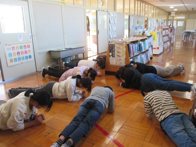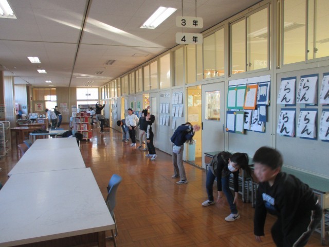 まず、校庭に出てマラソン、育てている花の世話をします。次に、校舎に入って本の貸し出し。現在「図書ビンゴ」週間のため、いつも以上に本の貸し出しが盛んです。そして、月曜の朝は、「ラジオ体操・目の体操」です。体幹運動もかっこよくなってきました。