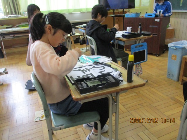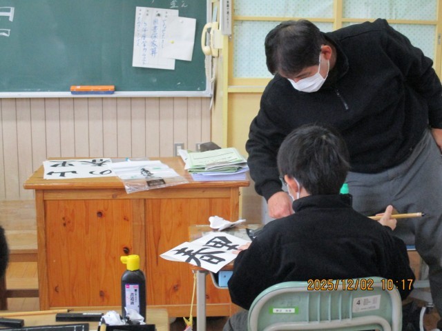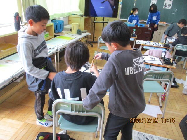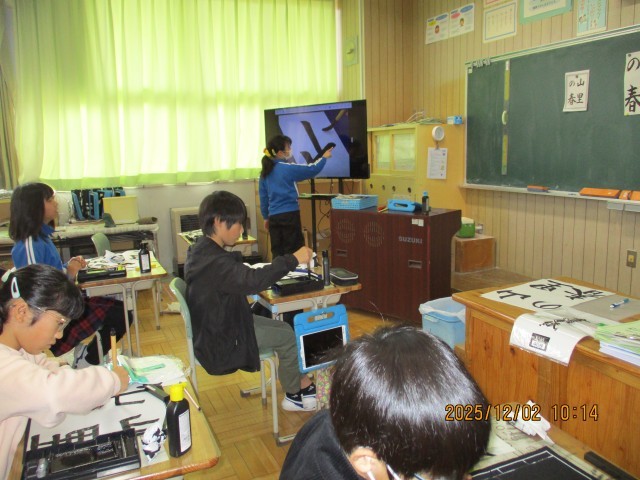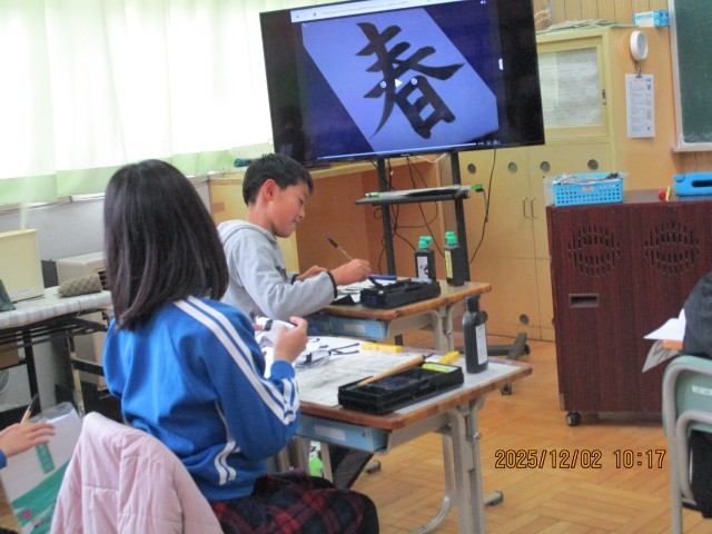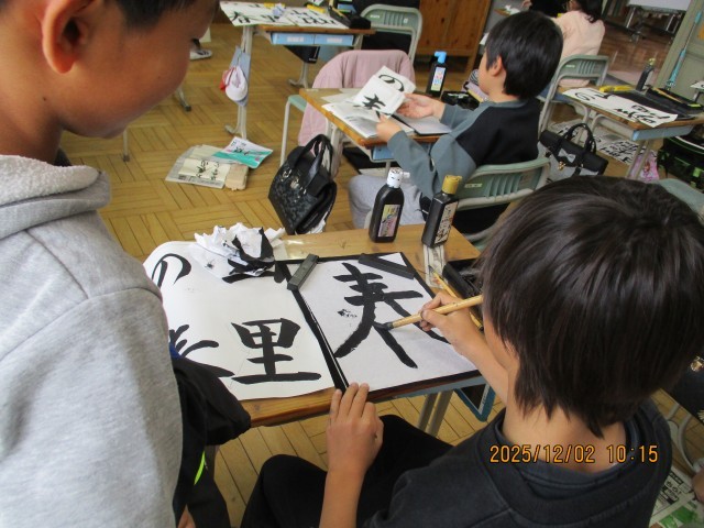 子どもたちは、里と春の空間の統一さを意識したり、「の」の筆の返し何回も練習していました。
