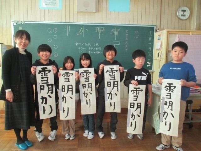 今日は4年生の書きぞめ教室でした。今年の課題は「雪明かり」です。
