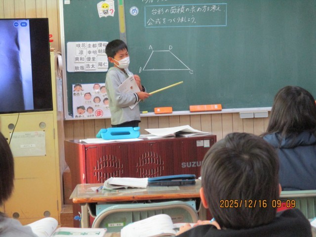 5年生の算数は、「台形の面積の求め方を考えて、公式をつくろう」でした。