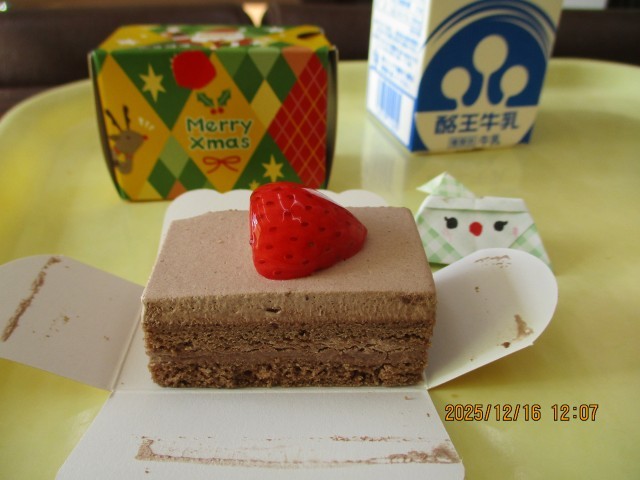 メニューは、黒糖パン、牛乳、チキンカツ、フレンチサラダ、野菜スープ、いちごショコラケーキです。