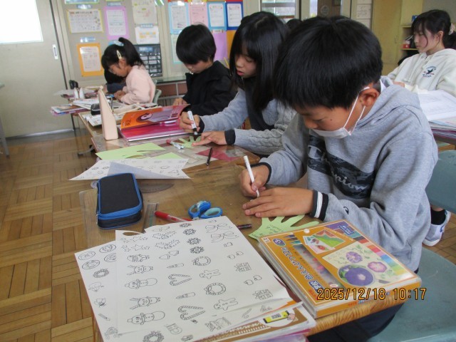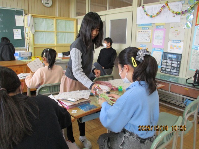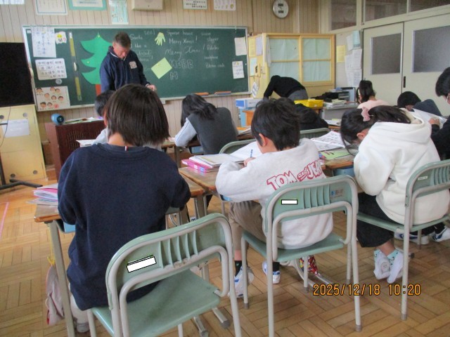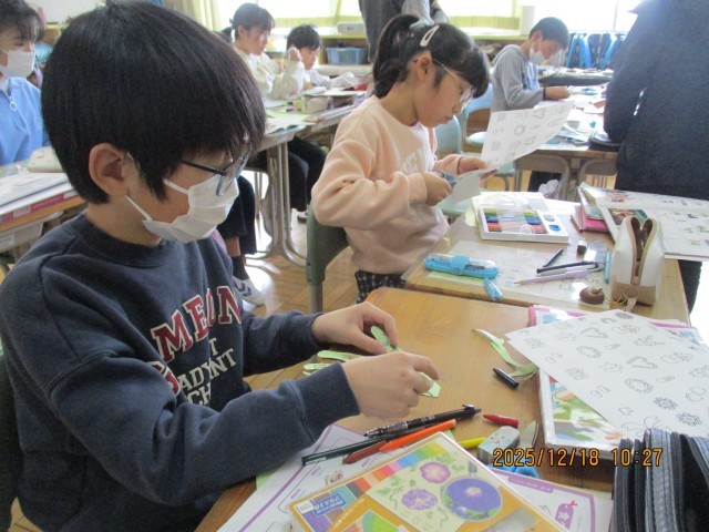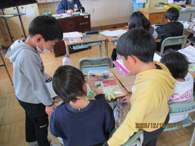 5年生の外国語科では、AETの先生と一緒に、クリスマスカード作りに取り組みました。