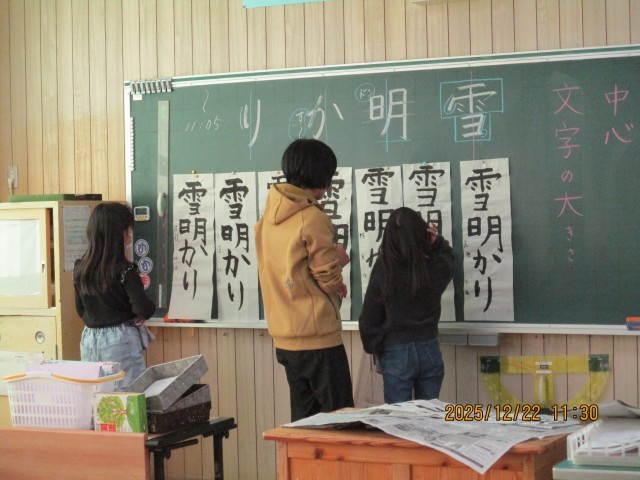 「雪明かり」のバランス:を黒板に貼ってみていました。「雪」が大きすぎず、「明」が大きすぎず、「り」が小さくまとまるように、全体でバランスを取るために先生からのアドバイスを受けていました。