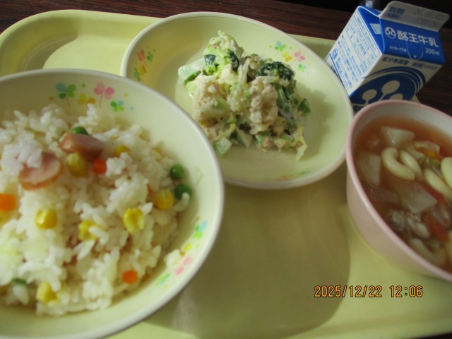 今日の献立は、コーンピラフ、ツナサラダ、ミネストローネスープ、牛乳でした。