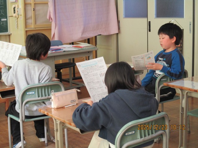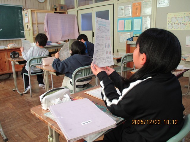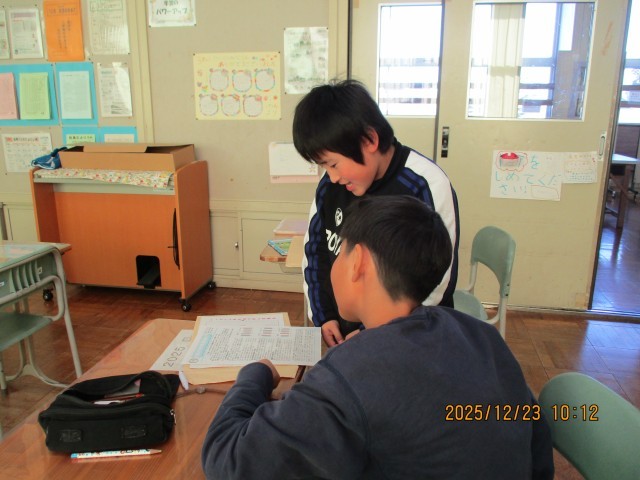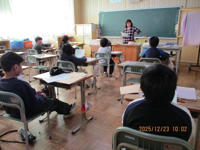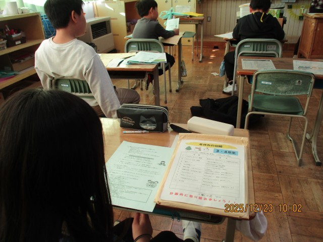3・4年生の複式学級では、2学期最後の学級活動として、学期の振り返りと冬休みの生活について話し合いました。