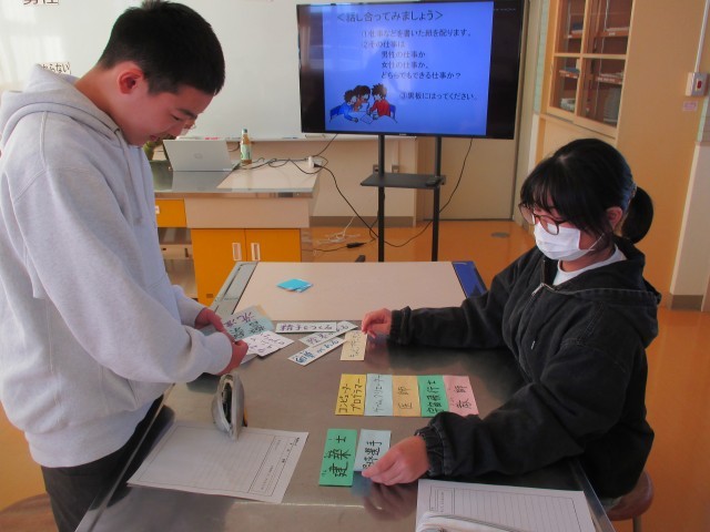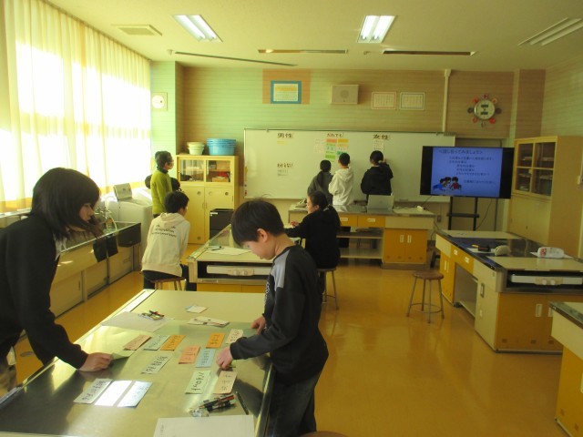 6年生は、「思春期のこころとからだ」をテーマにジェンダーについて考えました。職業や家事、体の名称やはたらきがそれぞれ書いてあるカードを、だれが行うのか(男性・女性・だれでも・分からない)友達と相談して、振り分ける活動をしました。言葉やイメージで振り分けたカードは、全体の話し合いの後、ほとんど「だれでも」の内容になりました。子どもたちは、見た目や性別で仕事を決めるのではなく、内容で決めることが大切だと感じました。