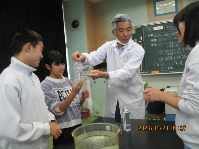 今日は、二酸化炭素を水に溶かし、炭酸水が本当に作れるのかどうかも実験しました。水の入ったペットボトルに二酸化炭素を入れて振ると、ペットボトルが激しくへこみ、水に二酸化炭素が溶けたことを身体で感じたり、石灰水が白く濁る様子を見たりして、炭酸水が作れることがわかりました。