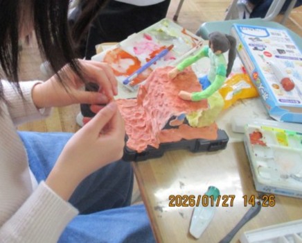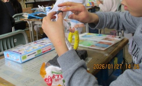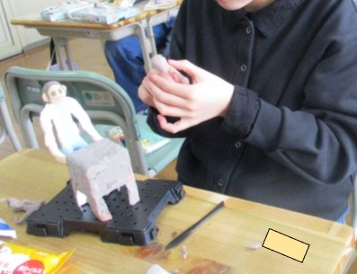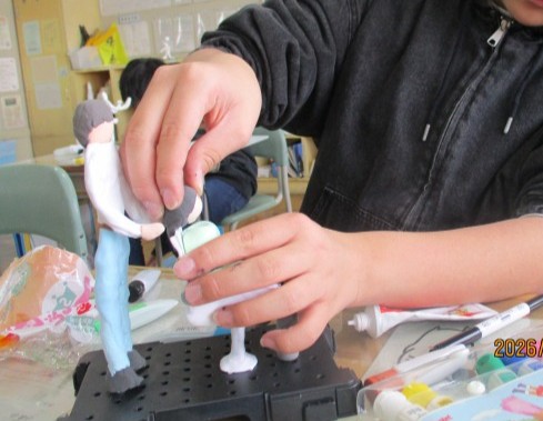 前時までに、芯材を組み立て、絵具を練りこんだ粘土をその周りにつけて、人の形を作りました。