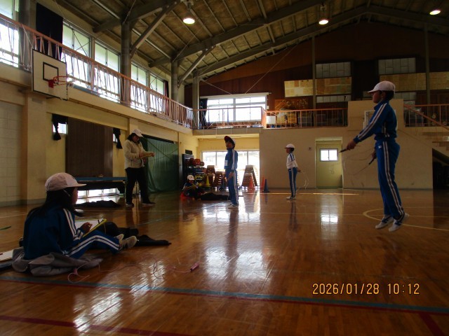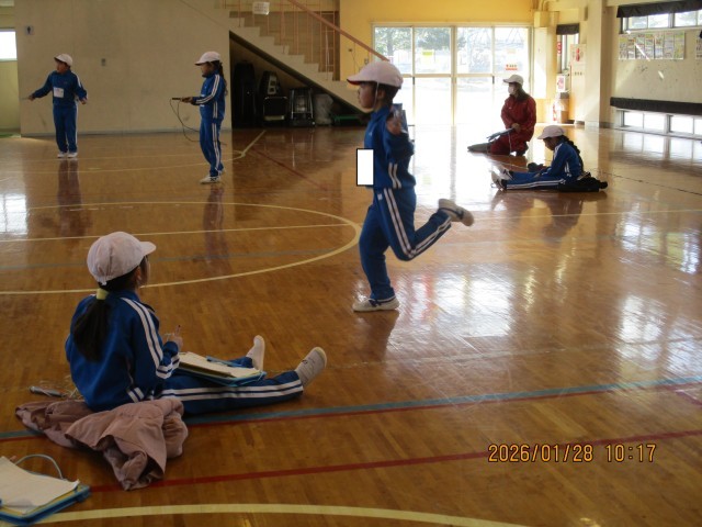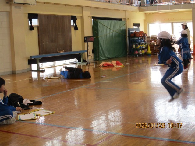 今日は「チャレンジ跳び」に挑戦し、自分で跳び方を決めて、3分間で最も多く跳べた回数を記録しました。