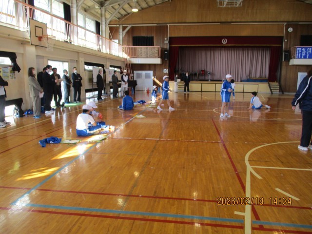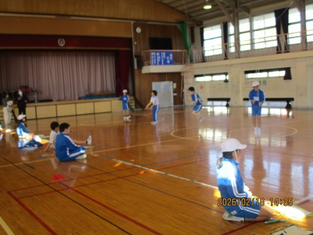 3・4年生の合同体育は、多様な動きをつくる運動として、「縄をリズムよく回し、連続跳びやいろいろな跳び方に挑戦することで、巧みに体を動かす力を身につける」ねらいで活動しました。
