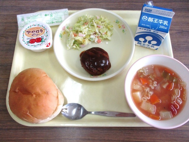 メニューは、バンズパン、牛乳、ハンバーグ、野菜サラダ、ミネストローネ、アセロラゼリーです。
