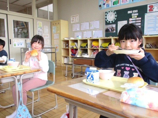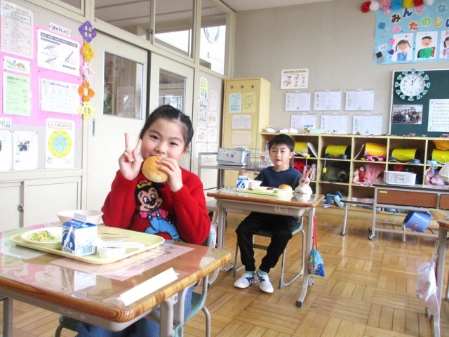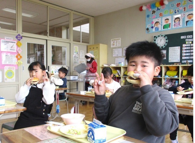 チーズ入りのハンバーグをパンにはさみ、おいしそうに頬張る子どもたち。教室は笑顔でいっぱいでした。