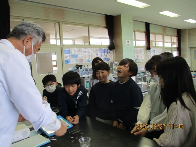 「電磁石のはたらき」では、電磁石の仕組みである「コイルに電流を流すと強い磁場ができ、この中に鉄を入れると磁化されて鉄が磁石になる」ということを全員で確認していました。