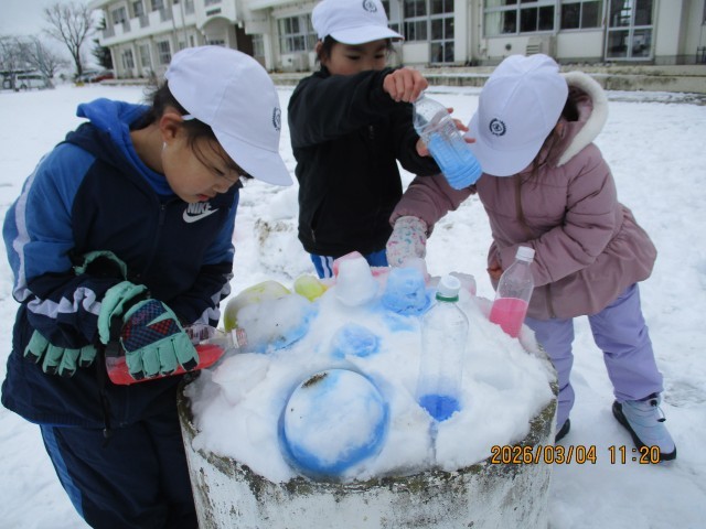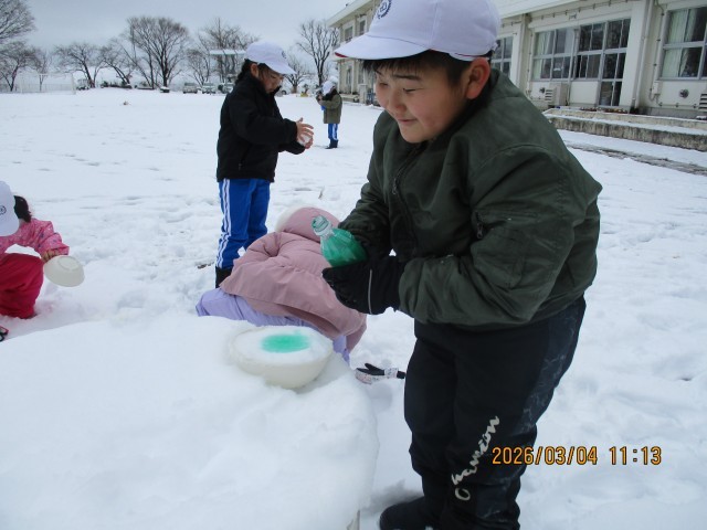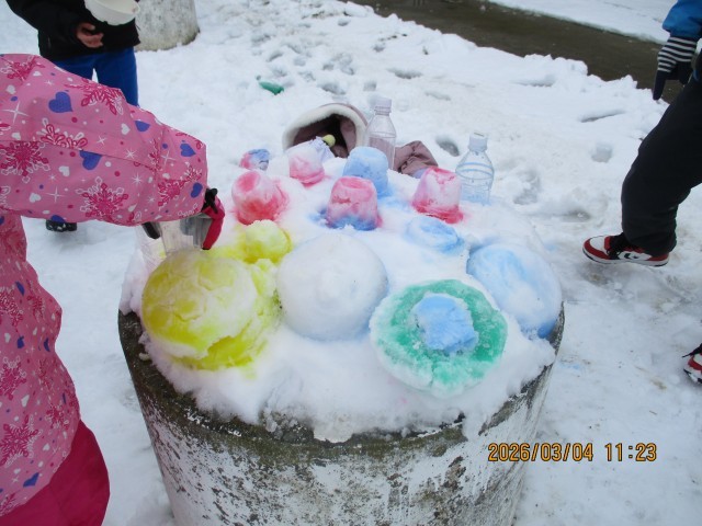 プリンカップや器に雪を詰めて、色水を混ぜてつくる「カラフル型抜き」を作りました。