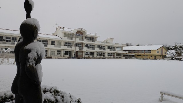 今朝は、小泉小学校のグラウンドも一面、雪化粧。