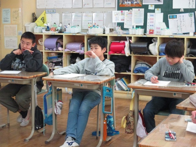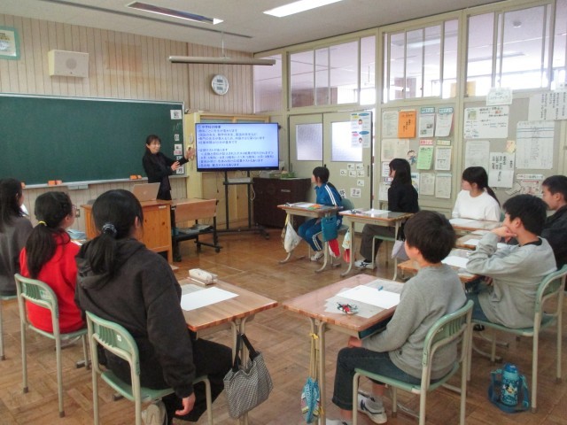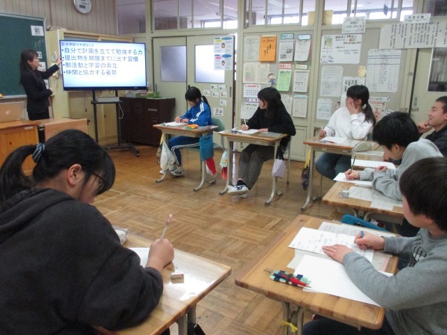 「中学校での学習や生活について」「定期テストについて」「家庭での学習や生活について」「中学校で大切なこと」など、資料を使って子どもたちが理解しやすいようにお話をしてくださいました。