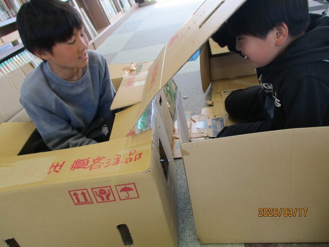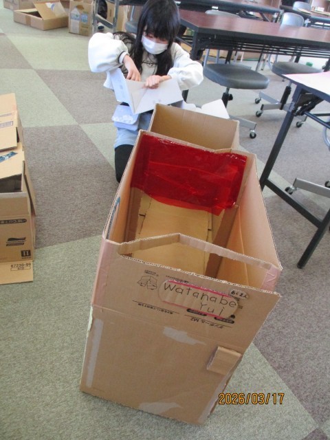 また、3年生の時の「クミクミックス」の学習を生かし、段ボールに切り込みを入れて組み立てる児童もいました。