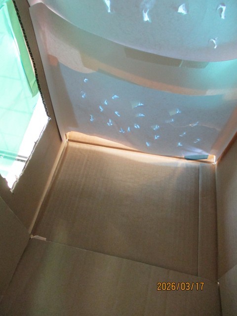 自分が入るくらいの大きな建物を作る児童もいれば、天井がプラネタリウムのように光るすてきな屋根の建物を作る児童もいました。