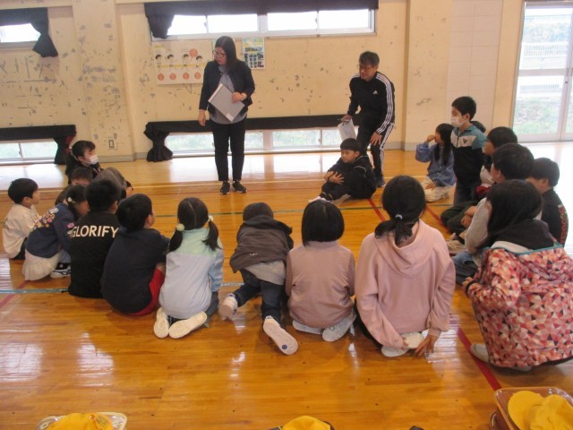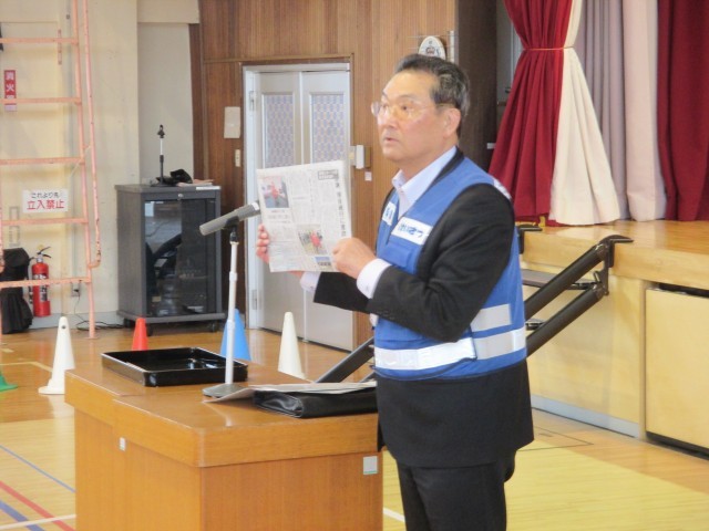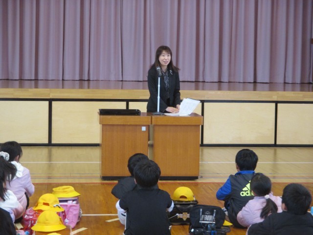 次に、スクールサポーターの方から交通安全の話をいただきました。道路の歩き方を考えて命を大切にしたいと考えられました。4月から自転車の違反運転の罰則が厳重になったことも伝えていただきました。ヘルメットをかぶって安全運転で乗りたいですね。