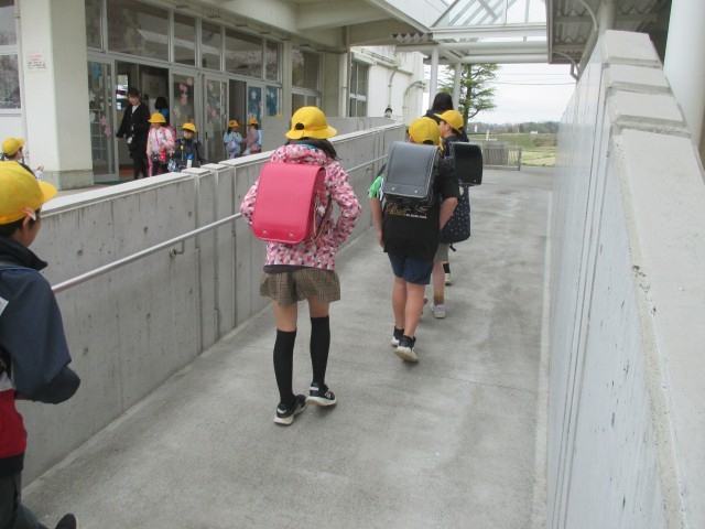 最後に、集団登校の集まる場所と時間の確認、危険な場所の確認を登校班みんなで確認しました。1年生や全体の歩くスピードを考えて登校することなどを担当教師から指導をしました。 その後、登校時と同じように、並んで歩いて集団下校をしました。