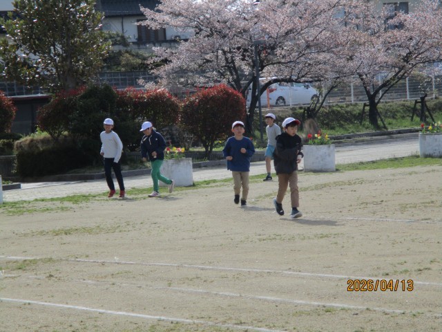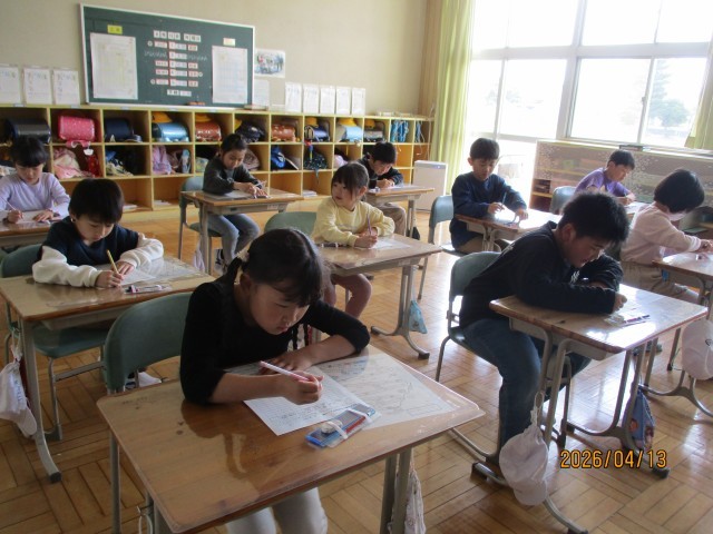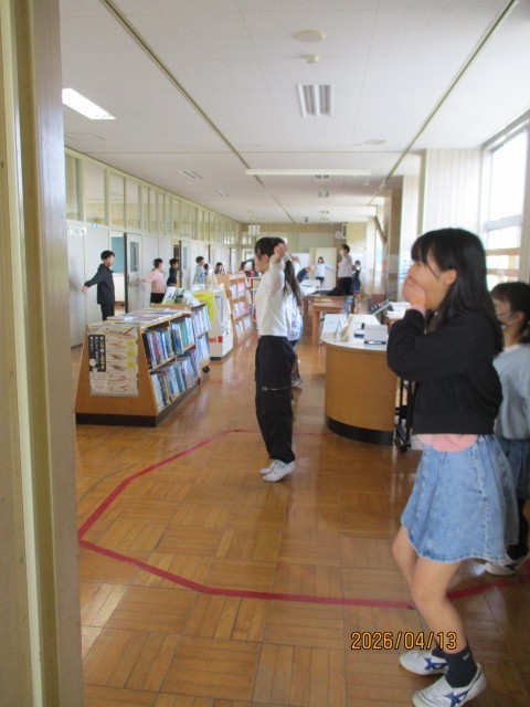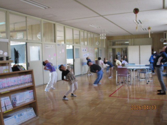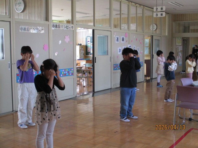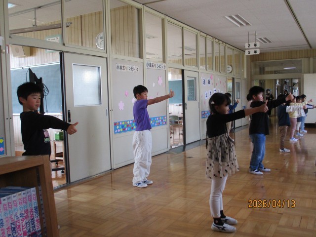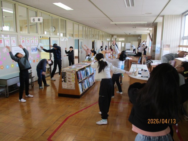 朝のマラソンの後、1・2・3年生は1階ワークスペース、4・5・6年生は2階ワークスペースに分かれ、全校でラジオ体操、アイアイ体操(眼筋の運動・マッサージ)、さわやかチェック(健康観察)を行いました。