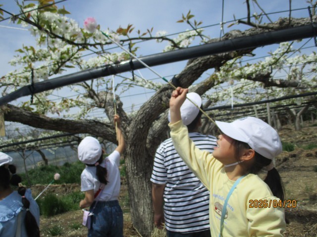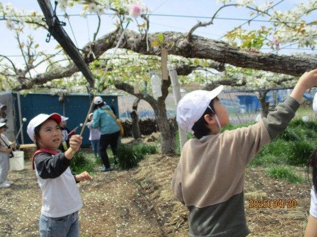 子どもたちは、「おいしい梨ができますように」と、ていねいにポンポンと授粉をしていました。