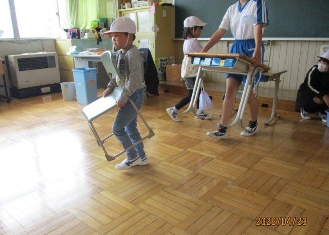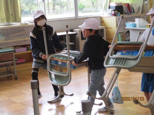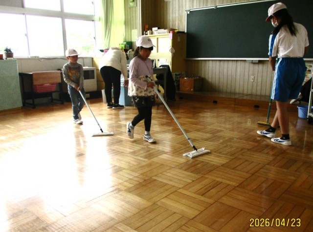 はじめてのお掃除では、上級生にモップのかけ方を教わったり、一緒に机を運んでもらったりしました。