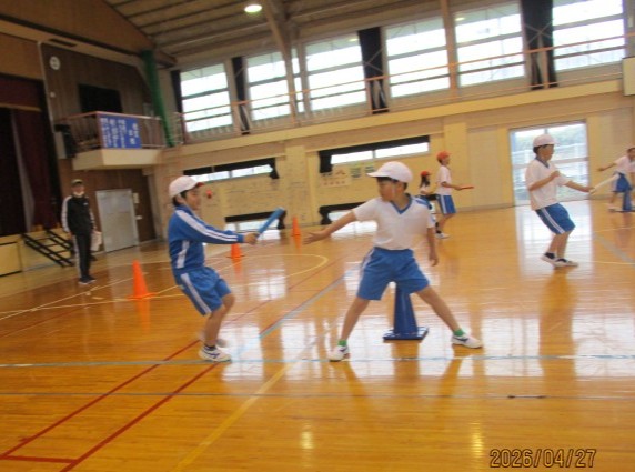 スポーツフェスタに向けてリレーのバトンパスの練習を行い、1・2年生は運動身体プログラムによる「動きたい体づくり運動」にも取り組みました。