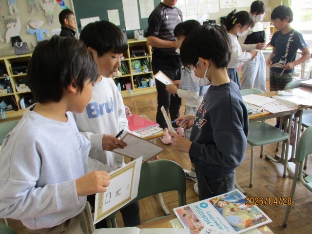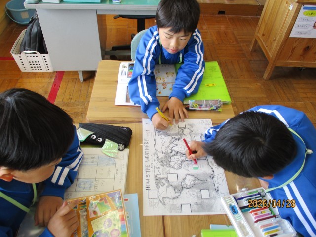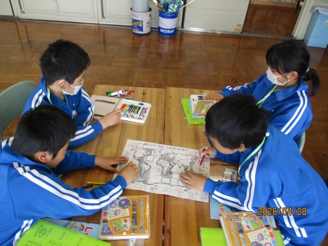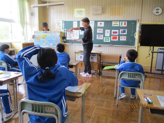 4年生は「Hello  world!」を題材に、様々な国のカードを使った活動を通して、友達とやり取りを楽しみながら英語表現に親しみました。