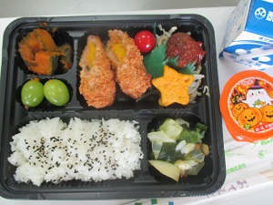 みんなが楽しみにしている今年度2回目のお弁当給食。今回はハロウィンにちなんで、かぼちゃをメインに秋に収穫された野菜や果物で彩られたお弁当給食でした。子どもたちの笑顔に調理員さんの疲れも癒されました。