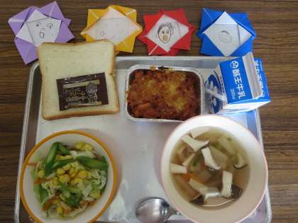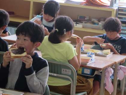 スープの深い味わいに感激し、チョコをたっぷり塗ったパンをパクッとかじり、さわやかなサラダを口に含む。うーん、おいしい。また、グラタンの濃厚な味には、スプーンの動きが止まりません。どの学級でも満足げな子どもたちの表情が見られました。