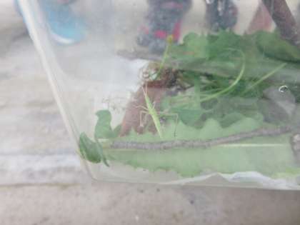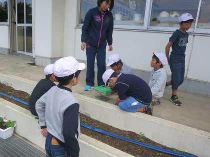 草取りをしていた3、4年生が見つけたのはバッタさんでした。