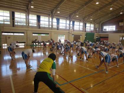 全校生が体育館に集合しました。係の先生から説明を受けた後、準備運動を行いました。本校は、1・6年生のグループ、2・5年生のグループ、3・4年生のグループの計7班編成で各種目を回っていきます。