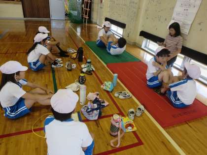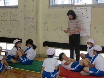 マット上にあおむけになり、両手を軽く握って両腕を胸の前で組みます。「始め」の合図で、上体を起こし、両ひじと両ふとももがついたら再びマットの上に体を倒す。この動作を繰り返します。腹筋や背筋の力が必要なので、かなりきついです。シェイプアップにはもってこいかも…。
