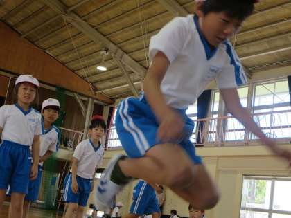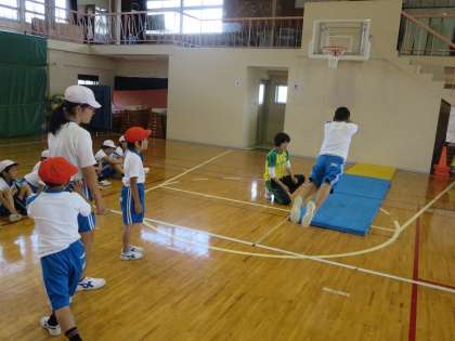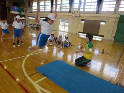 この種目はどの子にも取り組みやすいからか、かなり盛り上がっていました。特に着地したあとのポーズに個性が表れていました。少しでも前へ、前へ、という思いがしっかりと伝わってきましたよ。