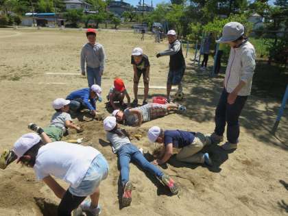 1つ目は「砂場の穴掘り隊」であります。主に2年生が中心となって、手で砂場を掘り進めています。やがて「冷たい水脈」に到達すると「ひんやりして気持ちいい」のだそうです。水は確認できませんが、確かに地中深くから掘り出された砂はひんやりしていましたね。
