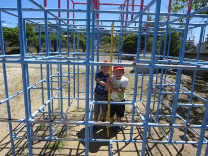 2つ目は「鬼ごっこ」であります。主に1年生が先生を鬼にして楽しそうに逃げ回っていました。つかまりそうなピンチになると、上手にジャングルジムに逃げ込んでいました。終了時刻には「また、あとで遊ぼうね」と誘ってくれました。(しかし、それは実現しませんでした。それは、後の記事で紹介します)