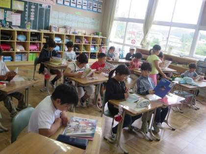 始業を伝える校歌のチャイム。3、4年生は朝の読書に取り組んでいました。10分間の静かで落ち着いたひとときが、授業に向かう心と頭をきたえているのです。