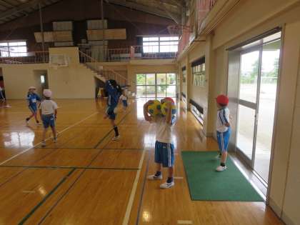 遊ぶ休み時間の小泉っ子。バスケットボールのシュートをねらう子ども。ボールでパス回しをする子ども。バドミントンをする子ども。小さな体育館の中ですが、友だちや先生たちといろんな遊びをし、笑顔があふれています。あっという間の20分間で、いい汗をかくことができました。でも、一緒に遊ぶことが楽しくて写真を撮ることをすっかり忘れてしまいました…。(あわててパチリしたときは、後片付けの場面でした。)