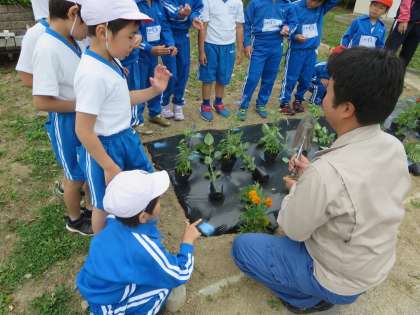 6月15日(金)に低学年の子どもたちが校庭東側の花だんに集合していました。