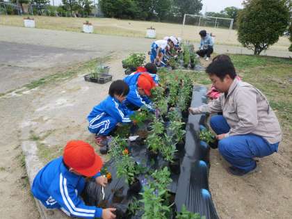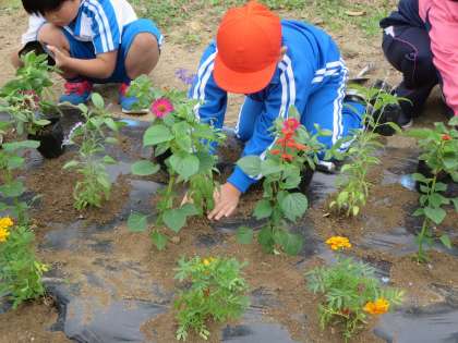 学んだことを生かしながら低学年の子どもたちはマリーゴールドやサルビアなどの苗を植えていきました。始めは苦労してましたが、回数をこなしていくうちにマルチを切ったり土を掘ったりするスコップの使い方も次第に上手になっていきました。