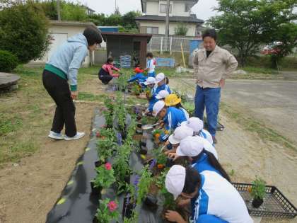 最後に土をかぶせるとき、てのひらでやさしく押さえていく子どもたちの姿に、花を大切に育てていきたいという思いを感じ取りました。