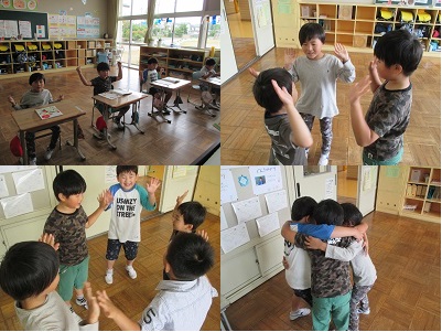 1年生の音楽の授業では、リズム打ちをしています。まずは一人で「たん」と「うん」を言いながら手拍子をします。上手にできたので、友だちとペアになって挑戦しました。それでは物足りず、「みんなでやろう!」と輪になりやってみると大成功!肩を組んで喜び合いました。友だちと協力して成功したり、息がピタッと合ったりした時の気持ちよさや喜びは、とても大切な経験ですね。