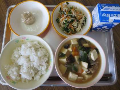 麦ごはん、牛乳、家常(ジャジャン)豆腐、肉シューマイ、もやしのラー油あえでした。