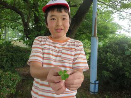 かんぷらパワーがみなぎる5年生が「見つけました!」とうれしそうに報告に来ました。四つ葉のクローバーですね。あなたもわたしもこれで幸せになりましょう、などと思っていたら別な5年生が「見つけました!」と手を差し出しました。
