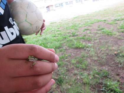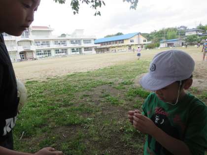 指のすきまからは、かわいらしいカエルさんがおじぎしていました。そうなると昆虫類が大好きな2年生が「みーつけたっ」とばかり、近寄ってきました。やさしい5年生からゆずりうけると、飼育するために教室へダッシュしていきました。