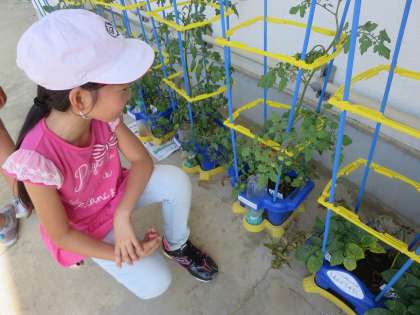 2年生に大声で呼ばれたので行ってみると、育てているミニトマトのいくつかが赤く色づいていました。「もう食べられますよね」と実にうれしそうでした。一所懸命に育てているからこそ、収穫の喜びも大きいですね。