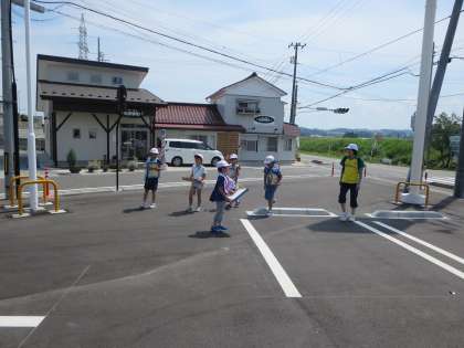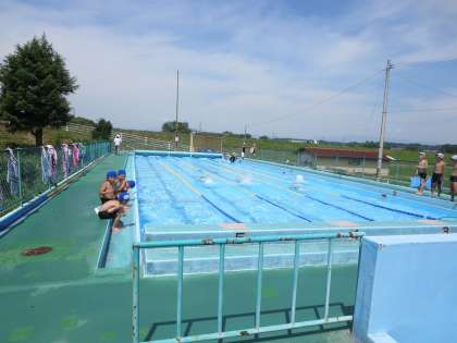 今日のプールではめずらしい組み合わせが…。中学年がビート板を使って練習しているコースの反対側には、かわいらしい1年生たちがいました。いつもペアを組んでいる2年生は、その頃プールより1kmほど西の福原東地区を町たんけん中でありました。